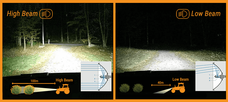 - Low Beams are for safe, close-range visibility when working near other people or machines, or in poor weather.