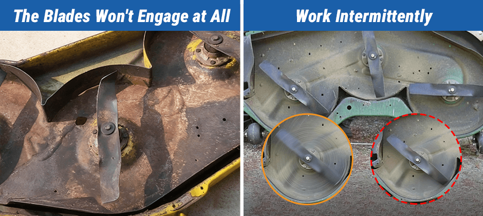 If your engine runs but the blades won’t turn on, the problem is almost certainly the PTO switch or its circuit.